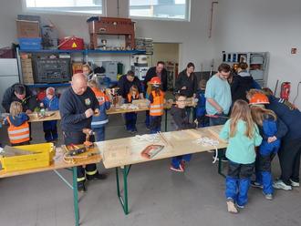 Nur Übung macht den Meister. Das wissen auch schon die Kleinsten der Jugendfeuerwehr Münchweiler und deshalb wurde die Garage der Feuerwache am letzten Freitag kurzerhand zur Werkstatt umfunktioniert. Unter der Leitung von Kreisjugendwart Hermann Jung entstanden mit tatkräftiger Unterstützung der Eltern 20 Knotenbäume, mit denen die Bambinis jetzt auch im Kinderzimmer fleißig weiterüben können. Der Knotenbaum zeigt exemplarisch 5 Feuerwehrknoten, die an einem sechsten, freien Holm geübt werden können. Ob Ankerstich oder Mastwurf – das Repertoire an Knotenvarianten, welche die Einsatzkräfte der Feuerwehr beherrschen müssen, ist groß. Spielerisch werden hier also schon die ersten Steine der Grundausbildung gelegt. Gelacht, gelernt, gestaunt und selbst ausprobiert wird jeden Freitag um 16:30 in der Feuerwache Münchweiler, wenn sich der Nachwuchs der Jugendfeuerwehr Münchweiler in der Bambini-Runde trifft.