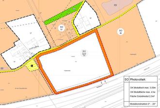 Auf dem Flurstück 2847 soll nun eine Photovoltaik-Freiflächenanlage errichtet werden. Die derzeitige Planung sieht eine maximale Modulfläche von 4,0 ha vor. Das Flurstück wird komplett umzäunt. Die innere Erschließung soll über einen Fahrweg in der Mitte der Parzelle erfolgen. Zum Betrieb der Freiflächenanlage ist die Errichtung von zwei Trafostationen notwendig.