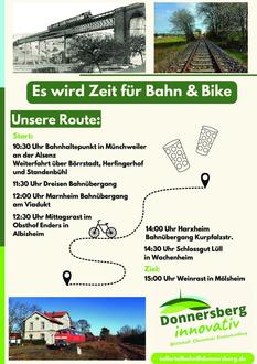 Treffpunkt ist um 10.30 Uhr am Bahnhaltepunkt in Münchweiler an der Alsenz. Optional haben Sie die Möglichkeit sich an den Haltepunkten der Tour anzuschließen.