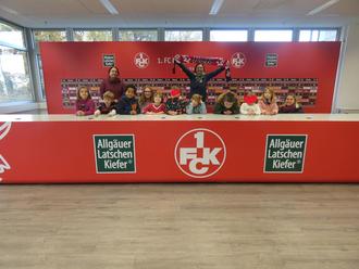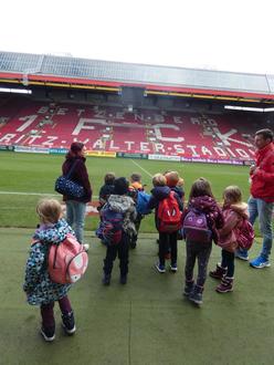 Bereits im November 2023 machten wir uns auf den Weg zum höchsten Fußballberg Deutschlands. Mit den Vorschulkindern besuchten wir das Fritz-Walter-Stadion in Kaiserslautern. Alle waren mit Begeisterung dabei und freuten sich auf die Führung durch das Stadion. An der Nordtribüne wurden wir in Empfang genommen. Von dort ging es direkt los in die große Fanhalle. Wir mussten ganz leise sein, da direkt über uns gerade eine Pressekonferenz statt fand.