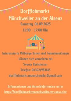 Am Samstag, den 06.09.2025, findet von 11:00 bis 17:00 Uhr der erste Dorfflohmarkt in Münchweiler statt. Verkauft werden darf alles – von Kinderkleidung über Hausrat bis zu echten Kellerschätzen. Mitmachen dürfen Privatpersonen auf ihren Grundstücken.