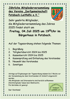 Die "Dorfgemeinschaft Potzbach-Leithöfe e.V." informiert: Einladung zur jährlichen Mitgliederversammlung