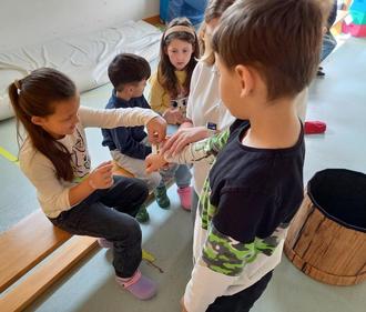 Im Kurs wurde unter anderem geübt, wie man im Notfall richtig handelt, angefangen mit der Notrufnummer: 112- Hilfe kommt vorbei! Die Kinder lernten zudem die Wundversorgung mit Pflastern und Verbänden.