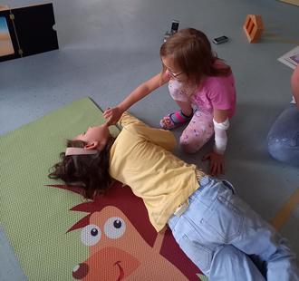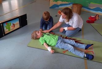 Im Silber-Kurs standen zusätzlich die drei Säulen des Lebens im Mittelpunkt. Die Kinder übten spielerisch die stabile Seitenlage mithilfe der 4 K`s: Kaktus, Kuscheln, Knie, Kinn.