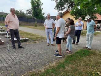 Nach Begrüßung des Landrates, dem Dank für sein Kommen und sein stetiges Interesse an der Gemeinde, was ebenso für den ebenfalls erschienenen Bürgermeister Rudolf Jacob gilt, durch Ortsbürgermeister Christoph Stumpf, begab sich die aus Beigeordneten, Gemeinderäten und Guth, Jacob und dem Ortschef bestehende Gruppe auf einen etwa einstündigen Dorfrundgang. Dieser führte vorbei an der Begegnungsstätte für Jung und Alt am Bürgerhaus, dem Rasenplatz des Turn- und Sportvereins, durch den bereits teilweise von privat sanierten Dorfkern in der Hauptstraße (ehemalige Metzgerei Hess und ehemalige Edeka-Filiale), zum Dorfmittelpunkt mit dem Ensemble bestehend aus Rentamt, Dorfbrunnen und Maibaum sowie dem gegenüber liegenden zentralen Dorfplatz mit seinem Wahrzeichen, dem Ojelmännche, und seiner nicht versiegelten, atmenden Fläche. Anvisiertes Ziel war der Friedhof, wo Stumpf den Landrat und die übrigen Rundgangteilnehmer zunächst auf die stark sanierungsbedürftige Begrenzungsmauer zum Anwesen Winnweiler Straße 1 (Franck) hinwies. Im Anschluss stellte der Ortschef die unlängst komplett sanierte Leichenhalle mit Beschallungsanlage und neuer Bestuhlung vor, den auf Friedhofsgelände erschlossenen großen Bauplatz (circa 1.400 m²) mit Raum für zwei Doppelhäuser sowie insbesondere den Parkplatz an der Ackerwiese, der mithilfe des Förderprogramms „Mehr Grün im Dorf“ unter der Federführung der ersten Beigeordneten Tanja Dautermann vollständig hergerichtet wird.