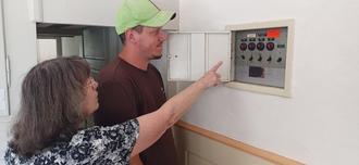 Das Bild zeigt die langjährige Kirchendienerin Ria Kuby, wie sie unserem Gemeindearbeiter Jan Kolb die Steuerung der Glocken erklärt