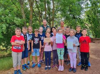 Dass sich die intensive unterrichtliche Vorbereitung sowie die Anstrengungen an diesem erlebnisreichen Tag wahrhaft gelohnt haben, erfuhr die Klasse erst einige Tage später: Unter den 14 teilnehmenden Klassen hatte die Sippersfelder 3a die meisten Punkte sammeln und den Sieg erringen können! Revierförster Dieter Gass, der der Mosaik-Grundschule höchstpersönlich einen Besuch abstattete, zollte den kleinen Waldprofis gebührende Anerkennung für ihre Leistung und zeichnete sie mit einer Urkunde als „Walddetektive“ aus. Als Erinnerungsstück hatte er zudem eine hübsch gravierte Holzplakette und eine weitere Überraschung im Gepäck: Als Sieger erhielt die Klasse einen Gutschein für einen Wald- und Erlebnistag auf dem Hofgut Neumühle. So dürfen sich alle gleich auf das nächste gemeinsame Abenteuer freuen, das Teamgeist, Naturverständnis und Umweltbewusstsein stärkt.