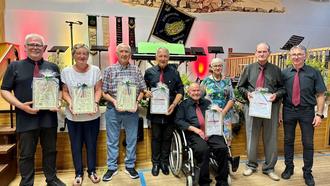 Bild von links nach rechts: 1. Reinhard Wolsiffer - 10 Jahre MGV, 2. Marion Dingler für Ehemann Helmut Dingler - Ehrenmitglied, 3. Paul Staab - Ehrenmitglied pass., 4. Jürgen Wolsiffer - 50 Jahre MGV, 5. Peter Danner - 70 Jahre MGV, 6. Christine Koch - Kreischorverband, 7. Wolfgang Molter - 70 Jahre MGV, 8. Sascha Elsenbast - Vorsitzender