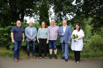 Das Foto zeigt die Jubilare und Geehrten. von links: Verbandsbürgermeister Rudi Jacob, Thomas Keller, Frau Jutta Selzer, Markus Buhrmann, Jürgen Heiler und Frau Martina Lummel-Deutschle.