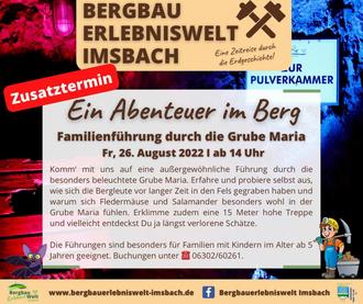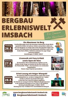Drei Tage mit einem unterhaltsamen Programm für Klein und Groß gibt es vom 26. bis 28. August in der Bergbau Erlebniswelt Imsbach. Während auf den Nachwuchs zum Start am Freitag ein Abenteuer im Berg wartet, gibt es am Samstagabend ein Open - Air - Kino in einmaliger Kulisse verbunden mit einem Live - Konzert. Und am Sonntag folgt schließlich eine Krimi - Lesung mit dem bekannten Fernsehmoderator Holger Wienpahl, zudem werden Führungen durch die Grube Maria und eine Geo - Tour rund um Imsbach angeboten.
