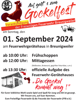 Die Freiwillige Feuerwehr Breunigweiler wird offiziell ihr seit 30 Jahren genutztes Feuerwehrhäuschen aufgeben und übergangsweise, bis zum Bau des geplanten neuen Gerätehauses, in einer Scheune in der Bergstraße Quartier beziehen.