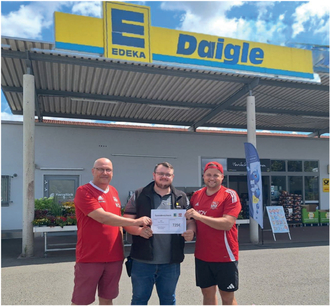 Alex Klein (Mitte) von Edeka Daigle überreicht den symbolischen Spendenscheck an die ASV-Organistoren Sebastian Sann (rechts) und Klaus-Dieter Schäfer.