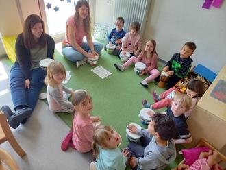 Im Januar versammelte sich in der Kita Arche Noah das erste Mal die Mu-Mi-Ki-Gruppe zum gemeinsamen Musizieren. Diese Gruppe setzte sich nach drei Probetreffen aus den Kindern die an dem Bildungsbereich Musik Interesse zeigten, zusammen. Jeden Donnerstag traf sich die Musikgruppe in unserer Kita und wurde von den Erzieherinnen Nathalie Krug und Melanie Walter, die sich in Musik mit der Simuki-Fortbildung weitergebildet hatten, begleitet. Zuerst machten sich die Mu-Mi-Kinder auf die Suche nach Orff-Instrumente in unserer Kita, lernten die Namen der Instrumente und ihren Klang kennen. Besonders interessiert waren sie an der Rassel, der Trommel und dem Regenmacher, so kam die Idee selbst diese Instrumente zu basteln. Bei der Herstellung der Instrumente hatte die Mu-Mi-Ki-Gruppe die Möglichkeit sich künstlerisch auszuleben. In Klanggeschichten und Rhythmusreimen kamen die Instrumente schließlich zum Einsatz. Zu jedem Musiktreffen sangen die Mu-Mi-Kinder ihr Begrüßungs- und Abschiedslied. Diese wurden mit passenden Bewegungseinheiten begleitet und hatten sich bei den Kindern als regelmäßiges Ritual schnell eingeprägt. Natürlich durfte das Tanzen nicht fehlen und mit bunten Tüchern machte es noch mehr Spaß. Die Mu-Mi-Kinder stärkten im Tüchertanz ihr Gemeinschaftsgefühl und hatten die Aufgabe während dem Tanz mit einem anderen Kind aus der Gruppe die Tücher zu tauschen. Der Tanz war bei dem Musikprojekt sehr beliebt und wurde mehrmals von den Kindern gewünscht. Nicht nur die Tücher im Tanz haben Farbe in das Projekt gebracht. In einem Projekttreffen wurde zur Musik gemalt und die entstandenen Kunstwerke wurden an unserem Osterfest, mit Künstlermotto, ausgestellt. Irgendwann kam die Frage: „Mit was kann man noch Musik machen?“ Im nächsten Treffen experimentierte die Musikgruppe mit Wassergläsern und wie ein Wunder kamen Töne dabei heraus. Aber die Mu-Mi-Kinder hatten am meisten Spaß mit Klanggeschichten und die Kinder sammelten eigene Ideen für eine eigene Klanggeschichte, bei der ihr beliebter Tüchertanz mit eingebaut war. Sie waren darauf so stolz, dass klar war, die eigene Klanggeschichte der Musikgruppe vor der gesamten Kita vorzuführen. Voller Aufregung fanden am 13.07 und 01.08 die beiden Aufführungen, einmal für die Kita-Kinder und anschließend für die Eltern, statt. Die Aufführungen waren von „Zugabe“-Rufen und lautem Applaus gekrönt. Damit wurde das Musik-Projekt erfolgreich abgeschlossen.