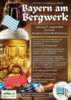 Mit in die Welt der Berge nehmen um 18 Uhr die Alphorn-Freunde Selztal die Gäste. Einst aus einer Bierlaune geboren, wurde 2008 ganz schnell ernst daraus. Viele Auftritte gab es seitdem, ob im Fernsehen, bei Oktoberfesten, Weinfesten, Alphorntreffen oder nun eben bei „Bayern am Bergwerk“ in Imsbach. Um 19 Uhr folgt dann ein Auftritt des Musikvereins Donnersberg auf der Bühne an der Grubenhütte. Der 1925 gegründete Musikverein aus dem benachbarten Steinbach bietet mit seinen rund 30 Musikerinnen und Musikern neben traditioneller Blasmusik auch moderne Unterhaltungsmusik. Im Anschluss wird dann noch ein DJ die Gäste weiter unterhalten.