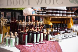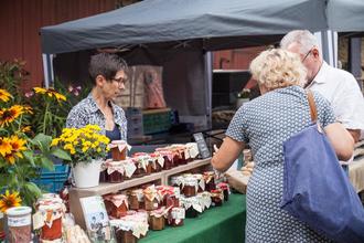 Produkte rund um die Kirsche, Kuchen und Torten, Chutneys, Marmeladen, Senf sowie verschiedene Essige und Öle, Honig, Chili-Produkte, Nudeln, Brände und Liköre, Gemüse, Kartoffeln, Fisch sowie Fleisch und Wurst aus der Region, Käsespezialitäten, mediterrane Köstlichkeiten und Gewürzmühlen.