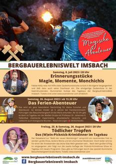 Am Freitag, 25., und Samstag, 26. August präsentiert Kelly Entertainment zum zweiten Mal gemeinsam mit der BergbauErlebnisWelt Imsbach und dem Förderverein der Ortsgemeinde ein Krimidinner auf dem Freigelände des Tagebaus vor der Weißen Grube. Erleben Sie die neueste Krimidinner-Produktion mit einer Mischung aus spannendem Schauspiel, einer witzigen und