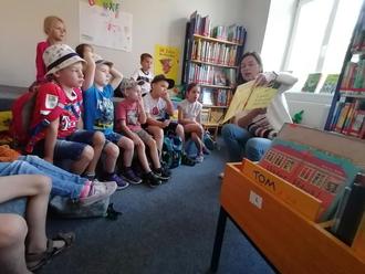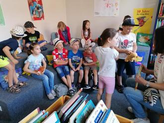 Am 15. Juli ging es dann gemeinsam mit zwei Erzieherinnen ebenfalls wieder nach Winnweiler. Diesmal waren wir mit dem Linienbus unterwegs. Am Bahnhof in Winnweiler erwartete uns schon Frau Wasem, die einige Monate bei uns ausgeholfen hat. Gemeinsam machten wir uns dann auf den Weg in die Gemeindebücherei Winnweiler. Dort durften die Kinder erst einmal als „Kinderzug“ durch die Bücherei reisen und diese entdecken. Nach einem gemeinsamen Picknick hat Frau Wasem passend zum Schulanfang das Bilderbuch „Vom Löwen der nicht schreiben konnte“ vorgelesen. Nach weiteren Erkundungen der Bücherei auf „eigene Faust“ war es dann auch schon wieder Zeit zurück nach Sippersfeld zu fahren. Es war für die Kinder ein schönes Erlebnis zu sehen wie unterschiedlich Büchereien sein können. Natürlich haben unsere Großen sich auch darüber gefreut, Frau Wasem wieder zu sehen. Auch für die Möglichkeit diesen Ausflug zu erleben, möchten wir uns herzlich bedanken.