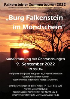 Am 9. September 2022 bietet sich bei der Sonderführung „Burg Falkenstein im Mondschein“ die Gelegenheit, diese einmalige Atmosphäre zu erleben. Lichtilluminationen in Bäumen und Felsen schaffen ein besonderes Ambiente, Laternen beleuchten die Wege, ein knisterndes Lagerfeuer sowie ein gemeinsamer Sundowner machen den Abend zu einem besonderen Erlebnis.