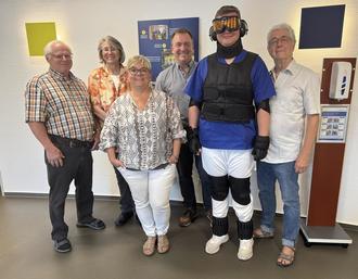 Bei der Vorstellung des Altersanzuges ist Maximilan Gauch – ein Auszubildender des Westpfalzklinikums, der zur Zeit im Praxiseinsatz bei der Sozialstation ist – sichtlich beeindruckt. Neben den Einschränkungen für das Gehör und die Sicht lasten rund 30 Kilo Gewichte auf ihm. „Eine sehr gute Erfahrung, die mir hilft, mich besser in die Situation von älteren Menschen zu versetzen“, lobt Gauch die Anschaffung.