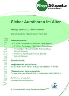 Auto fahren im Alter ist ein sehr sensibles Thema - bietet doch das Auto ein großes Stück Unabhängigkeit und Freiheit, erst recht in einem Flächenlandkreis. Zuletzt ist das Thema nochmals in den Fokus der Öffentlichkeit gerückt mit einer möglichen Überprüfung der Fahrtauglichkeit für Personen über 70 Jahren. Doch sind Senioren wirklich Unfall gefährdeter? Gibt es Erkrankungen, bei denen man lieber nicht mehr fahren sollte? Was kann ich tun, wenn mein hochbetagter Nachbar die Ecken "rund" macht? Was kann ich selbst tun, um wieder "sicherer" Auto zu fahren? Dieses und mehr sind Fragen, die im Rahmen einer Infoveranstaltung am 22.09.2023 im Roten Saal in der Donnersberghalle in Rockenhausen behandelt werden. Zu Gast sind Fr. Paul von der Polizeidirektion in Kaiserslautern, Fr. Ginkel, Psychologin im Pfalzklinikum, Hr. Schreiber, Leiter der Führerscheinstelle im Donnersbergkreis und Hr. Kremer von der Fahrschule Bernardy. Die Veranstaltung ist kostenfrei. Eine Mindestteilnehmerzahl ist erforderlich.