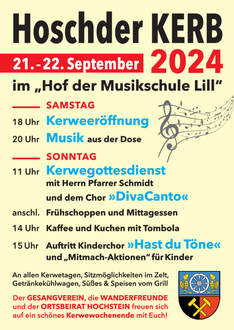 vom 21. bis 22. September 2024 geht’s in Hochstein richtig rund, denn wir feiern „Hoschder Kerb“.