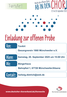 Zur offenen und unverbindlichen Schnuppersingstunde am Samstag, 20.09.2025 von 15:00 bis 18:00 Uhr lädt der Chor „TonArt“ im Gesangverein 1860 Münchweiler e.V. herzlich ins Bürgerhaus Münchweiler ein!