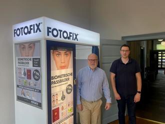 Bürgermeister Rudolf Jacob und der Referatsleiter Bürgerdienste, Dominik Lothschütz, freuen sich, den Kundinnen und Kunden des Einwohnermeldeamtes den neuen Service eines Fotoautomaten anbieten zu können.