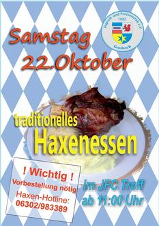 Auf dem Gonbacher Bolzplatz liegt von 11 Uhr bis 16 Uhr der Duft von gegrillten Haxen in der Luft. Wer deftige Leckerbissen zu schätzen weiß, kommt beim Jugend- und Freizeitclub Gonbach auf seine Kosten. Knusprige Schweins-Grillhaxen mit Kartoffelpüree und einer Portion Sauerkraut, dazu ein frisches Bier (Pils/Weizen) vom Fass. Auf der reichhaltigen Speisekarte stehen u.a. noch: Bratwurst, Rotkraut, Leberknödel, sowie Qualitätsweine und natürlich auch alkoholfreie Getränke.
