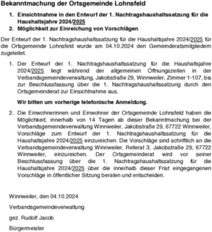 Der Entwurf der 1. Nachtragshaushaltssatzung für die Haushaltsjahre 2024/2025 für die Ortsgemeinde Lohnsfeld wurde am 04.10.2024 den Gemeinderatsmitgliedern zugeleitet.