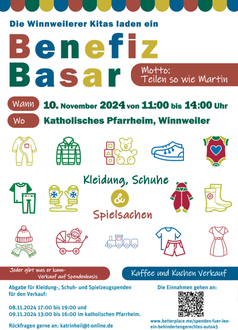 Unter dem Motto „Teilen so wie Martin“ findet am 10.11.2024 von 11-14 Uhr zum dritten Mal ein Benefizbasar mit Kuchenverkauf im katholischen Pfarrheim in Winnweiler statt. Auch in diesem Jahr wird die Aktion gemeinsam von Eltern der drei Winnweilerer Kitas und weiteren Freiwilligen organisiert und durchgeführt.