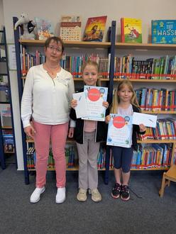 von links: Büchereileiterin Heilwig Dietrich mit Emilia und Sophia Wiegel
