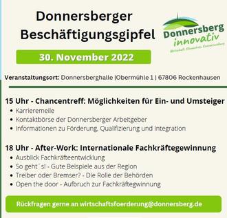 Für den „Donnersberger Beschäftigungsgipfel“ ist eine vorherige Anmeldung per E-Mail an wirtschaftsfoerderung@donnersberg.de erforderlich.