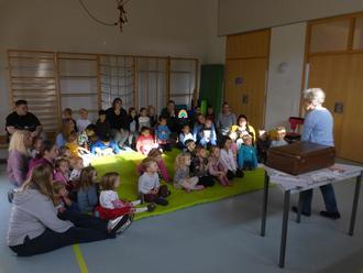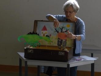 Am Freitag, den 06.10.2023 war Frau Wolf schließlich mit ihrem Koffertheater zu Besuch bei den Kindern und Erzieherinnen der Kindertagesstätte „Unterm Regenbogen“ in Lohnsfeld. In ihrem Koffer „befinden sich immer wieder neue, der Jahreszeit entsprechende Geschichten“, erklärte Renate Wolf den kleinen und großen Zuschauern vor ihrer Vorführung. Als sie anschließend ihren alten braunen Lederkoffer öffnete, offenbarte sich ein liebevoll selbst gestaltetes Bühnenbild samt Stabpuppen. Sehr geübt und kindgerecht präsentierte die ehemalige Lehrerin Janoschs Bilderbuchgeschichte „Das Apfelmännchen“ und erntete zum Ende viel Applaus vom begeisterten Publikum.