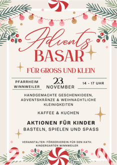Der Förderverein für die katholische Kita Winnweiler plant für Sonntag, den 23.11.2025 von 14:00 - 17:00 Uhr einen bunten Verkauf im kath. Pfarrheim. Für Speis und Trank und auch ein Kinderprogramm wird gesorgt sein.