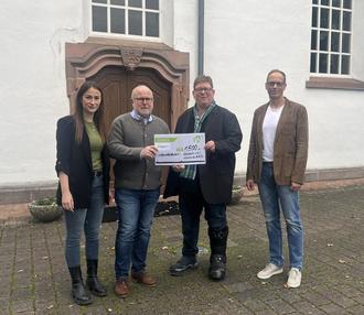 Übergabe des Spenden-Schecks von Marcella Franck (VG Winnweiler) und Bürgermeister Jacob an Markus Schreiber (Förderverein Kreuzkapelle) gemeinsam mit Steffen Brack (Mitorganisator)