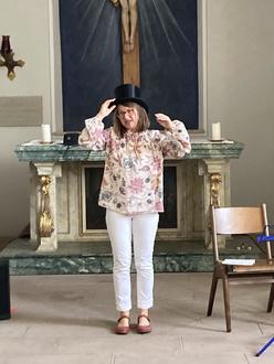 Während die Kinder ihre Plätze einnahmen, sah man am Altar eine immer wieder veränderte Szene: Eveline Ackermann tauschte – zur Erheiterung der Anwesenden – einen Hut nach dem anderen aus. Bei ihrer Ansprache führte sie eine regelrechte Hut-Parade auf.
