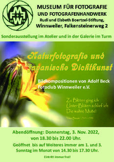 Im Museum für Fotografie und Fotografenhandwerk in Winnweiler, Falkensteinerweg 2, wird derzeit die Sonderausstellung „Naturfotografie und japanische Dichtkunst. Bildkompositionen von Adolf Beck, Fotoclub Winnweiler e.V.“ gezeigt. Für Donnerstag, den 3. November 2022 lädt das Museum aus Anlass dieser Ausstellung zu einer Abendöffnung von 18.30 Uhr bis 22.00 Uhr ein. Der Fotograf ist dabei anwesend und wird interessierten Besuchern gerne seine Bilder erläutern. Diese Ausstellung wird noch für den Rest des Jahres 2022 an allen Öffnungstagen des Museums zu sehen sein.