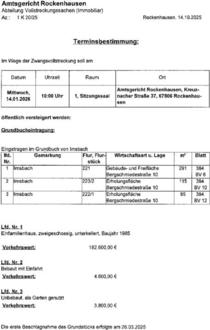| Mittwoch, 14.01.2026 | 10:00 Uhr | 1, Sitzungssaal | Amtsgericht Rockenhausen, Kreuznacher Straße 37, 67806 Rockenhausen |
