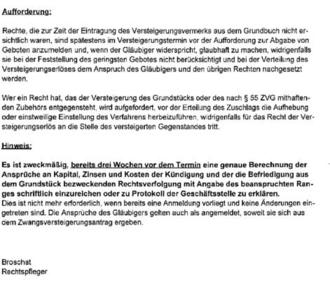 Es ist zweckmäßig, bereits drei Wochen vor dem Termin eine genaue Berechnung der Ansprüche an Kapital, Zinsen und Kosten der Kündigung und der die Befriedigung aus dem Grundstück bezweckenden Rechtsverfolgung mit Angabe des beanspruchten Ranges schriftlich einzureichen oder zu Protokoll der Geschäftsstelle zu erklären.