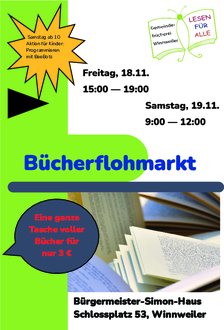 Für nur 3 Euro dürfen sich alle Interessierten eine ganze Tasche mit Lesestoff füllen. Es sind Bücher für alle Altersgruppen und zu vielen Themen vorhanden: Romane, Krimis, Thriller, Kinder- und Jugendbücher, Sachbücher und vieles mehr. Der Flohmarkt findet im Erdgeschoss des Bürgermeister-Simon-Hauses, Schlossstraße 53 statt.