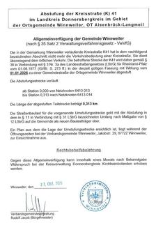 Abstufung der Kreisstraße (K) 41 in Winnweiler OT Alsenbrück-Langmeil
