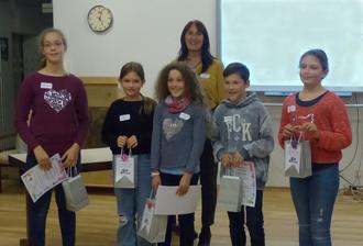 Schüler aus der 5 bzw. 6 Jahrgangsstufe des Wilhelm-Erb-Gymnasiums, Winnweiler hatten die Möglichkeit ihr Können bei einer Bildergeschichte unter Beweis zu stellen. Auch hier hatten die Teilnehmer die Möglichkeit sich kurz vorzubereiten. Es war sehr Interessant zu hören, wie aus einer Bildergeschichte doch 5 unterschiedliche Geschichten entstehen. Alle Teilnehmer haben die Aufgabe mit Bravour gemeistert. Nach der Auswertung der Punkte standen die Gewinner fest. Magdalena Gaedtke kann sich über eine 3. Platzierung freuen, Samuel Orschiedt belegte den 2. Platz und der 1. Platz geht an: Smilla Krauß.