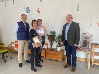v.li. Personalratsvorsitzender Peter Schneller, Erzieherin Martina Luft, Kita-Leiterin Nadine Grünewald-Schuler und Bürgermeister Rudolf Jacob