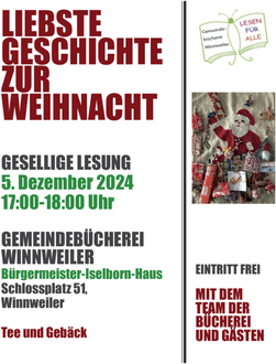Bei Tee und Gebäck wird es am Donnerstagnachmittag, 5. Dezember 2024 ab 17:00 Uhr in der jahreszeitlich geschmückten Gemeindebücherei Winnweiler am Schlossplatz vorweihnachtlich und gemütlich. LeserInnen und Teammitglieder lesen aus ihren liebsten Weihnachtsgeschichten. Wer sich noch beteiligen und eine kurze Geschichte von bis zu 10 Minuten beitragen möchte, ist herzlich willkommen!