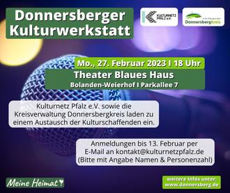 Rund 60 Kulturtreibende hatten sich im Frühjahr des vergangenen Jahres bei der ersten Kulturwerkstatt im neuen Zirkushaus des Kinder- und Jugendzirkus Pepperoni in Rockenhausen zu verschiedenen Themen ausgetauscht. Nach der erfolgreichen Premiere folgt nun am Montag, 27. Februar, 18 Uhr, im Blauen Haus im Bolander Ortsteil Weierhof die zweite Auflage, zu der das Kulturnetz Pfalz sowie die Kreisverwaltung Donnersbergkreis gemeinsam die Kulturschaffenden rund um die höchste Erhebung der Pfalz einladen.