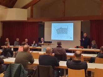 Der Freie Stadtplaner, Dipl.-Ing. Reinhard Bachtler (rechts stehend), erläutert anhand einer Powerpoint-Präsentation die Planungen zum Neubaugebiet „Elf Morgen“ neben Publikum und Presse (v. li.) dem Beigeordnetem Theo Bundenthal, dem Leiter Bauamt der VG Winnweiler, Roland Schreiber, den Beigeordneten Bernd Riffel und Tanja Dautermann sowie Ortsbürgermeister Christoph Stumpf. Im Vordergrund verfolgen Mitglieder des Rates die Ausführungen aufmerksam.
