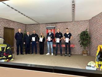 Zur Hauptfeuerwehrfrau / zum Hauptfeuerwehrmann wurden befördert: Jürgen Merz, Martin Seifert, Björn Thorn, Christian Hartmüller, Cedrik Gebhardt, Leonie Stock, Matthias Weber, Joshua Müller, Nils Liefländer