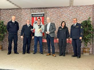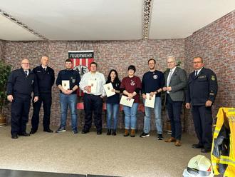 Für 15 Jahre Feuerwehrdienst wurden mit dem Bronzenen Feuerwehrehrenzeichen geehrt: Kai Becker, Patrick Hahn, Timo Krämer, Selina Ritzmann, Pascal Sprenger, Claudia Wuttke, Lea Juanne Zewinger