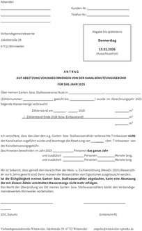Es besteht auch die Möglichkeit, die durch Zwischenzähler mit gültiger Eichgüligkeit festgestellte Wassermenge, die nachweislich nicht der Kanalisation zugeführt wurde, abzusetzen. Der Antrag kann mit einem formlosen Schreiben oder einem Vordruck, der in dieser Ausgabe abgedruckt ist, erfolgen und ist bis spätestens Donnerstag, 15. Januar 2026 bei den Verbandsgemeindewerken, Jakobstraße 29, Gebäude 2, 2. Etage, 67722 Winnweiler, einzureichen.