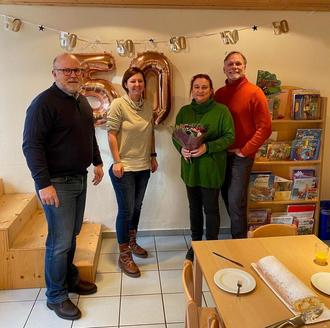 In der Kita Steinbach feierte dieser Tage Frau Simone Geib ihren 50. Geburtstag. Die Jubilarin ist bereits seit mehr als 25 Jahren in den Kitas der Verbandsgemeinde Winnweiler beschäftigt. Im Februar 2016 übernahm sie die stellvertretende Leitung der Kita Steinbach, wo sie sich besonders für den Erhalt des Bewegungskindergartens einsetzt. Frau Geib ist sehr naturverbunden. Aktivitäten im Außenbereich bereiten ihr besonders viel Spaß. Auch regnerisches Wetter hält sie nicht davon ab, mit den Kindern einen Ausflug zum nahegelegenen Wald zu machen. Die jährliche Fledermauswanderung für unsere Vorschulkinder ist dank der Jubilarin ein fester Bestandteil unserer Vorschularbeit geworden.